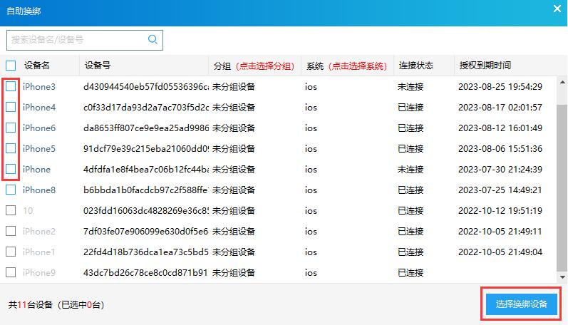 1、同账号下无论设备是否连接都可自助换绑,但是已删除的设备则需要将其重新连上才能自助换绑。(如果是不用的手机请先换绑后,再删除)软件端左侧的设备不要随意删除,确定换绑后再去删除!!!