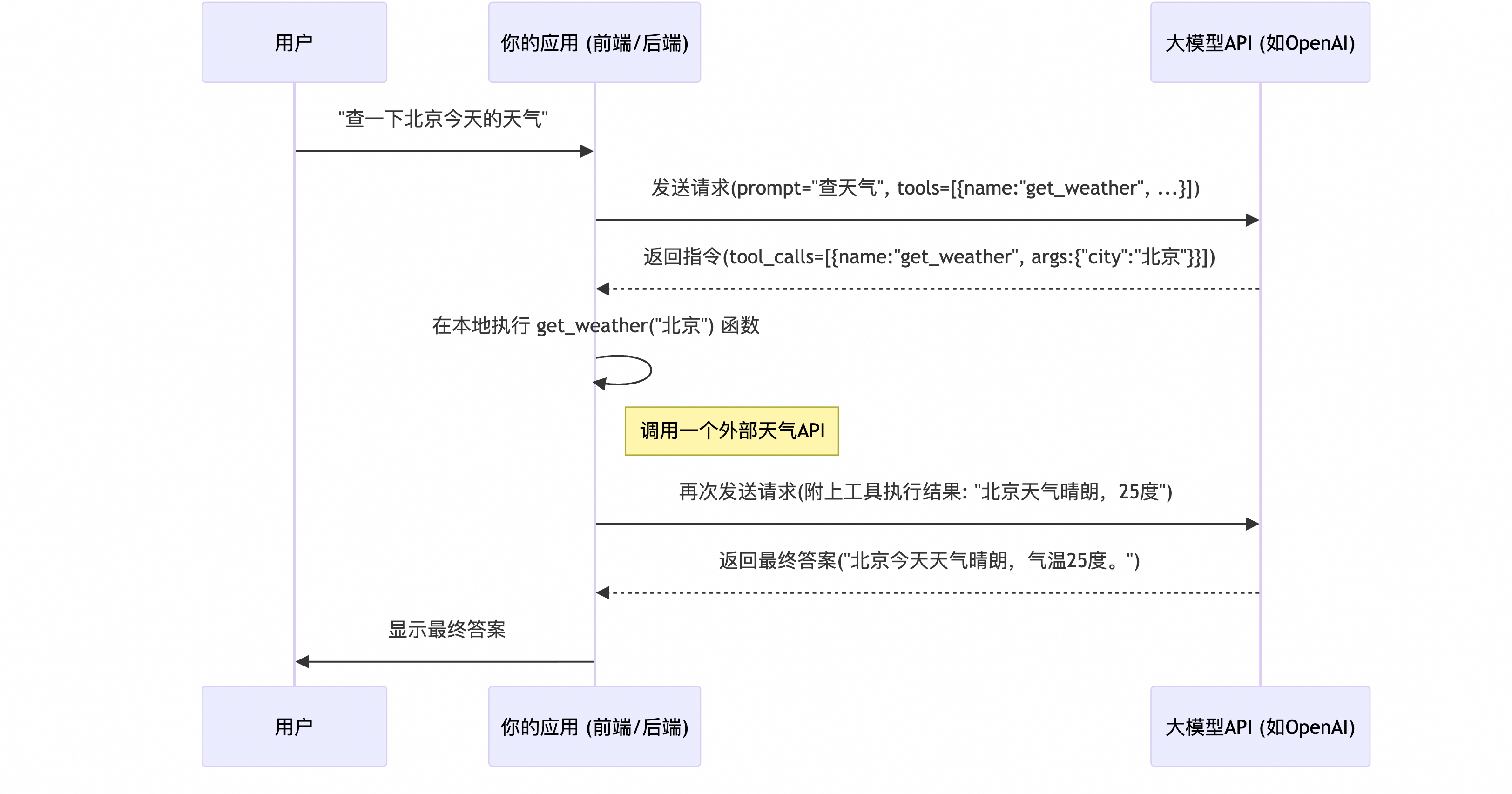 App->>LLM_API: 再次发送请求(附上工具执行结果: "北京天气晴朗,25度")