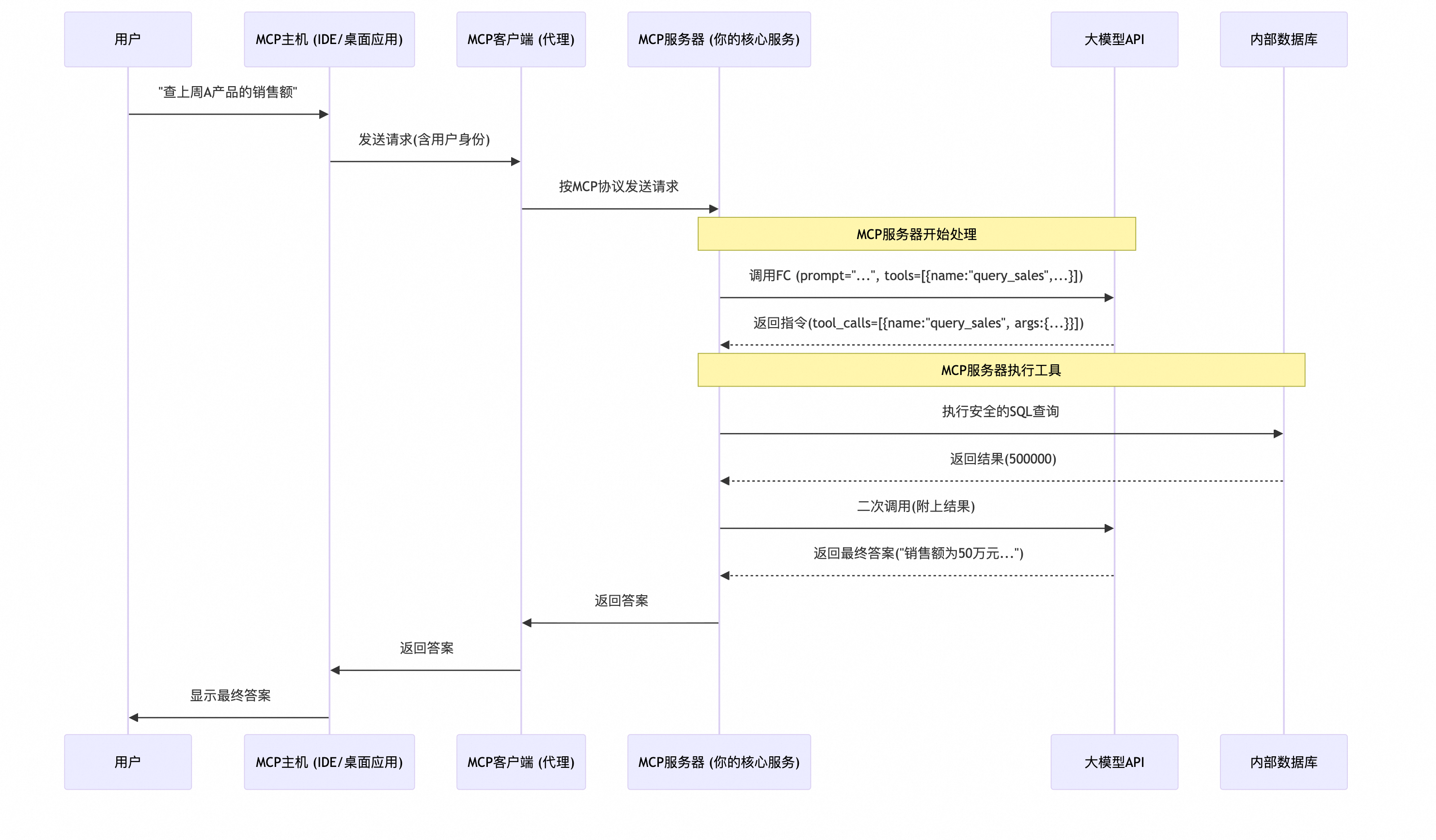 MCP_Server->>LLM_API: 调用FC (prompt="...", tools=[{name:"query_sales",...}])