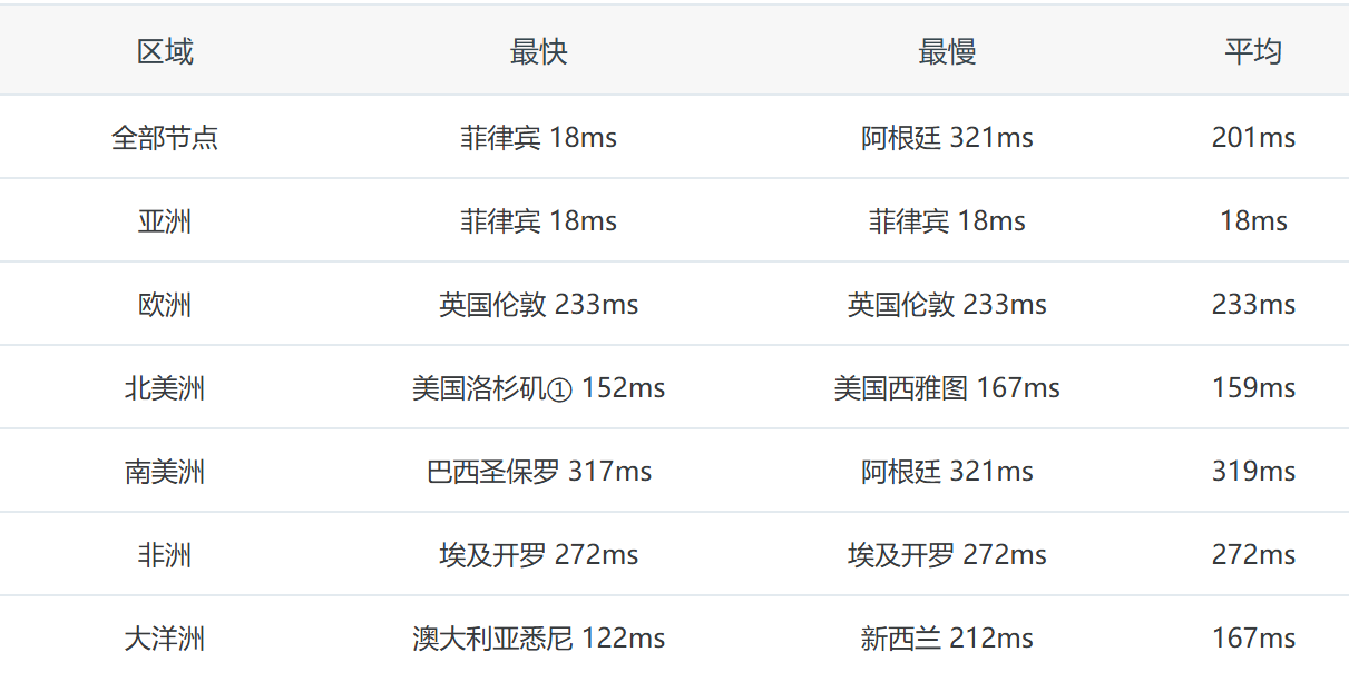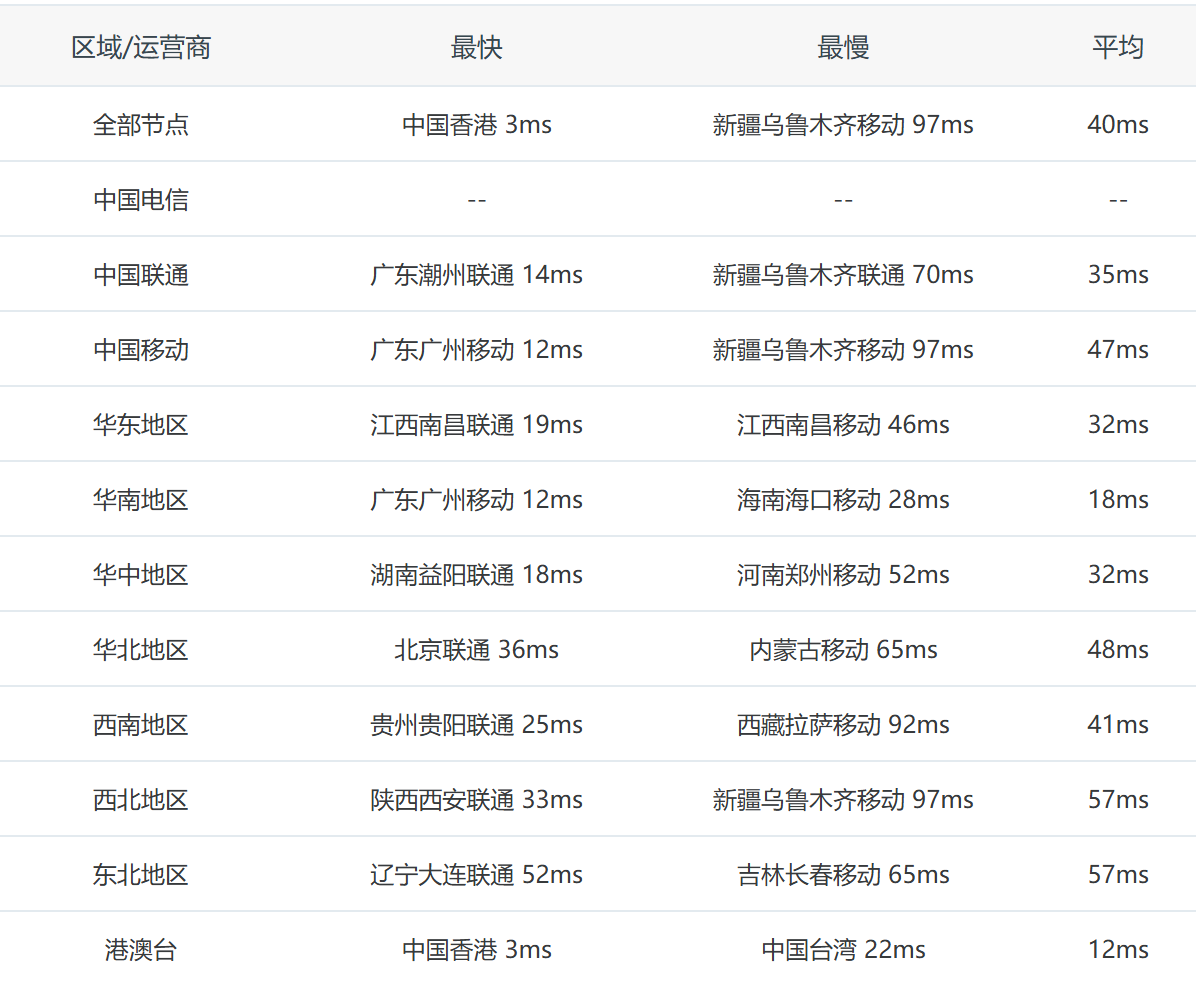 1.网络延迟优秀,基本上大陆都能在50ms以下