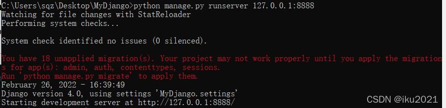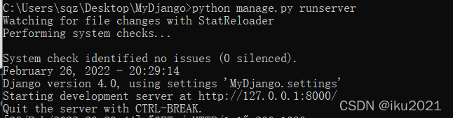 2.然后输入python manage.py runserver,得到网址http://127.0.0.1:8000,再打开浏览器访问此地址,如下: