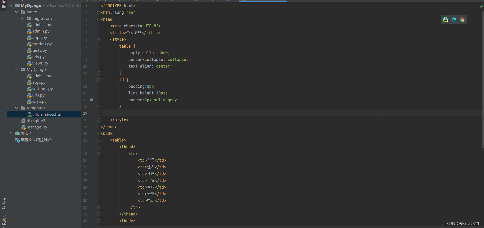 4.在templates目录里创建welcome.html页面,并输入个人信息用表格显示。