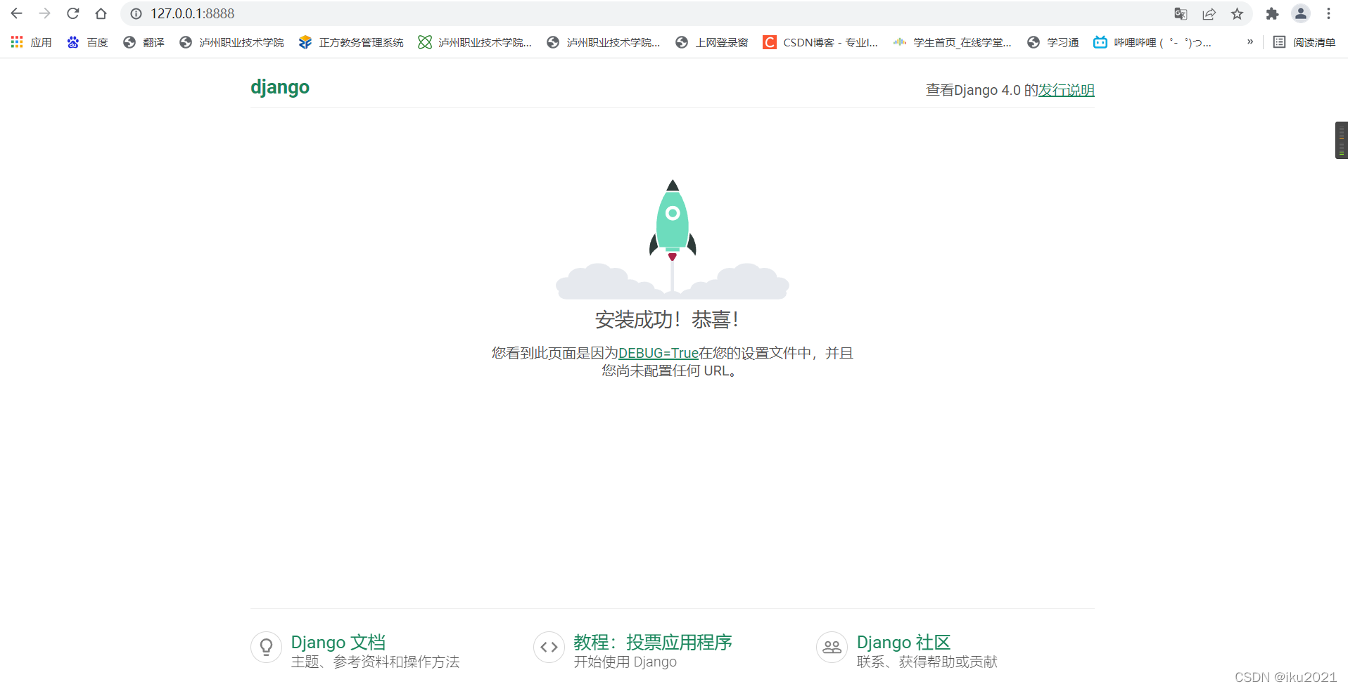 3.进入Mydjango目录,输入python manage.py runserver 127.0.0.1:8888,然后打开浏览器,访问http://127.0.0.1:8888,得到Django火箭欢迎界面。