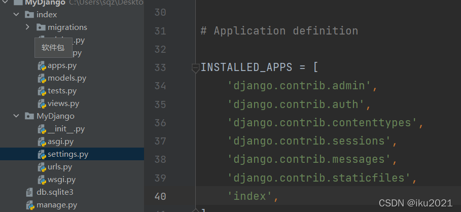 1.在项目的settings.py文件的INSTALLED_APPS列表里添加新创建的应用-index。