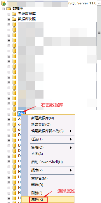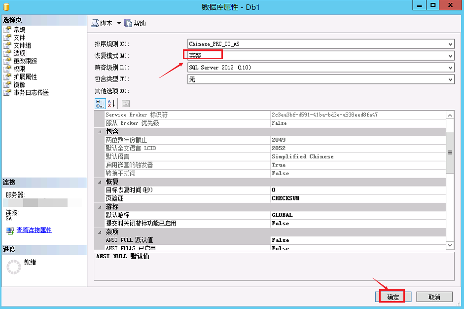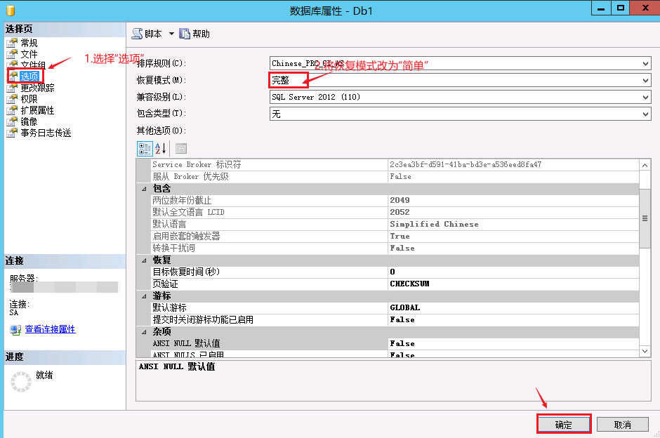 Db1,右键点击,选择 “属性(R)”; - 在 “数据库属性 - Db1” 窗口的左侧 “选择页” 中,点击 “选项”;