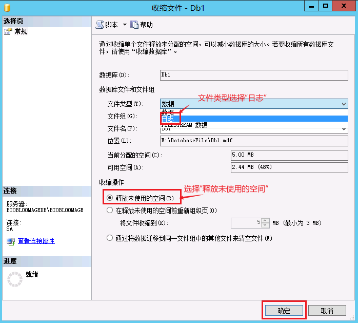 Db1_log),无需修改; - 收缩操作:选择 “释放未使用的空间(R)”(仅释放未使用的尾部空间,不移动日志数据,对性能影响最小);