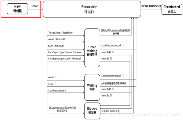 New 表示线程被创建但尚未启动的状态:当我们用 new Thread() 新建一个线程时,如果线程没有开始运行 start() 方法,所以也没有开始执行 run() 方法里面的代码,那么此时它的状态就是 New。而一旦线程调用了 start(),它的状态就会从 New 变成 Runnable,也就是状态转换图中中间的这个大方框里的内容。