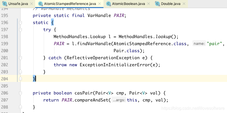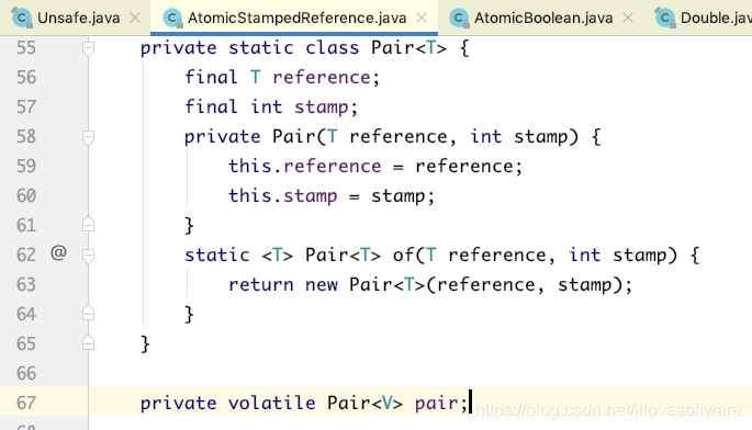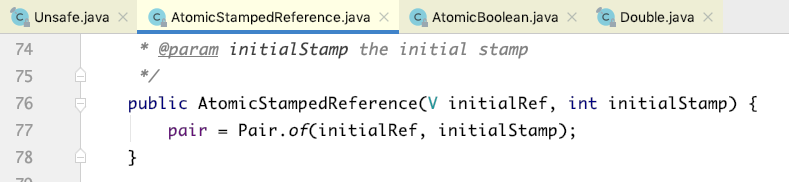 当使用的时候,在构造方法里面传入值和版本号两个参数,应用程序对版本号进行累加操作,然后调用上面的CAS。如下所示: