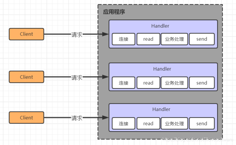 采用阻塞 IO 模式获取输入的数据, 每个连接都需要独立的线程完成数据的输入 , 业务处理和数据返回工作。