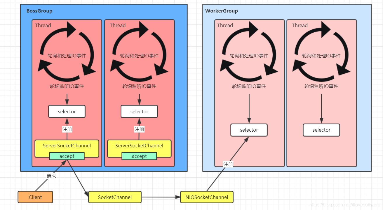 2.BossGroup 和 WorkerGroup 含有多个不断循环的执行事件处理的线程,每个线程都包含一个 Selector,用于监听注册在其上的 Channel。
