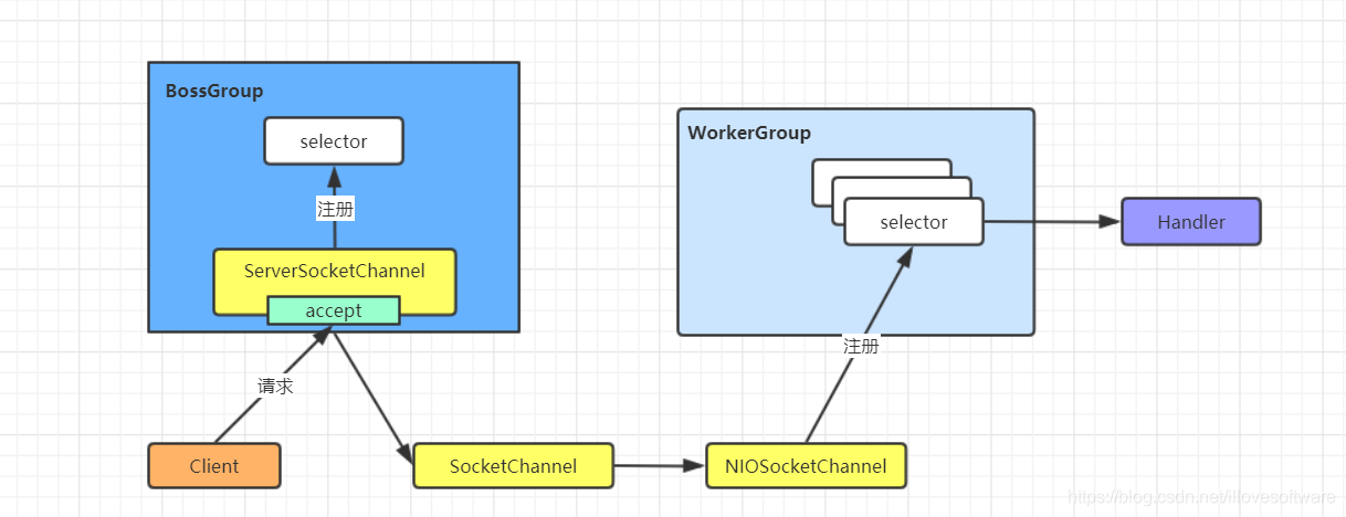 1.BossGroup 线程维护 Selector,ServerSocketChannel 注册到这个 Selector 上,只关注连接