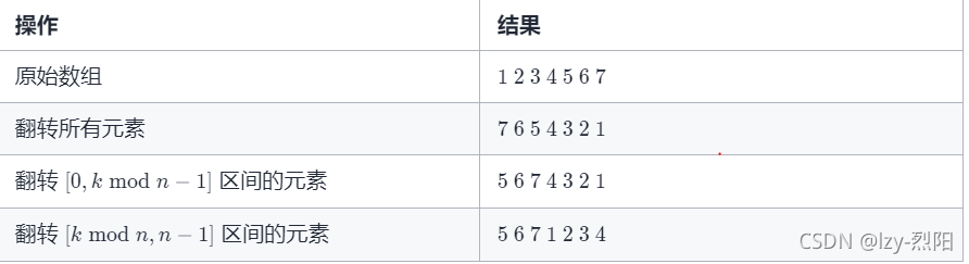 可以先将所有元素翻转,这样尾部的k mod n (取模/取余)个元素就被移至数组头部,然后我们再翻转 [0, k mod n-1][0,k mod n−1] 区间的元素和 [k mod n, n-1][k mod n ,n−1] 区间的元素即能得到最后的答案。