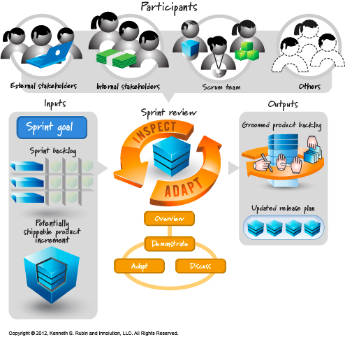 在图的中间,你会看到sprint评审会议图标。这个活动的关键是检视与调整sprint过程中产出的产品增量。这个图标的下边你会注意到一种举办sprint评审会议的方法。