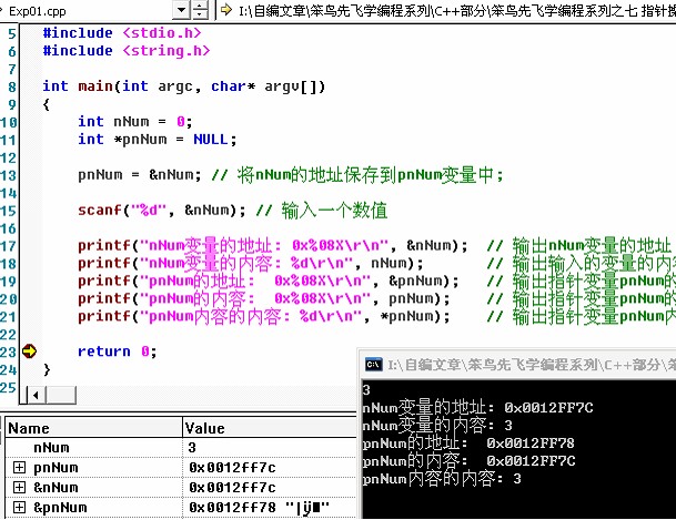 看明白了么?是不是可以理解成pnNum指向了nNum变量呢?由此,我们可以说,pnNum是nNum的指针。