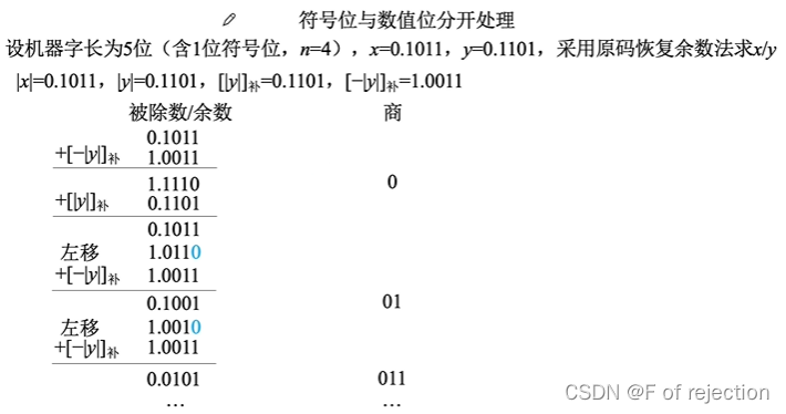 理解:当余数为负数时(记为a),商0,但不恢复余数,而是采用左移一位+除数(2a+b)的方法得到下一次商1的余数,从而化简步骤