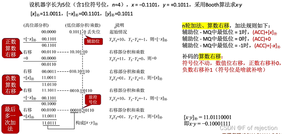 因为Y4Y5=1|0,所以Y5-Y4=-1,ACC=(ACC)+[-x]补,再进行高位部分积和乘数的同时算数右移,此时辅助位由0变为乘数移出的1;