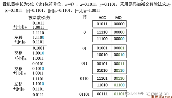 默认商1,余数 =余数+ [-Y]补=0.0111为正数,此时商=01101,因为机器字长5bit,到此结束