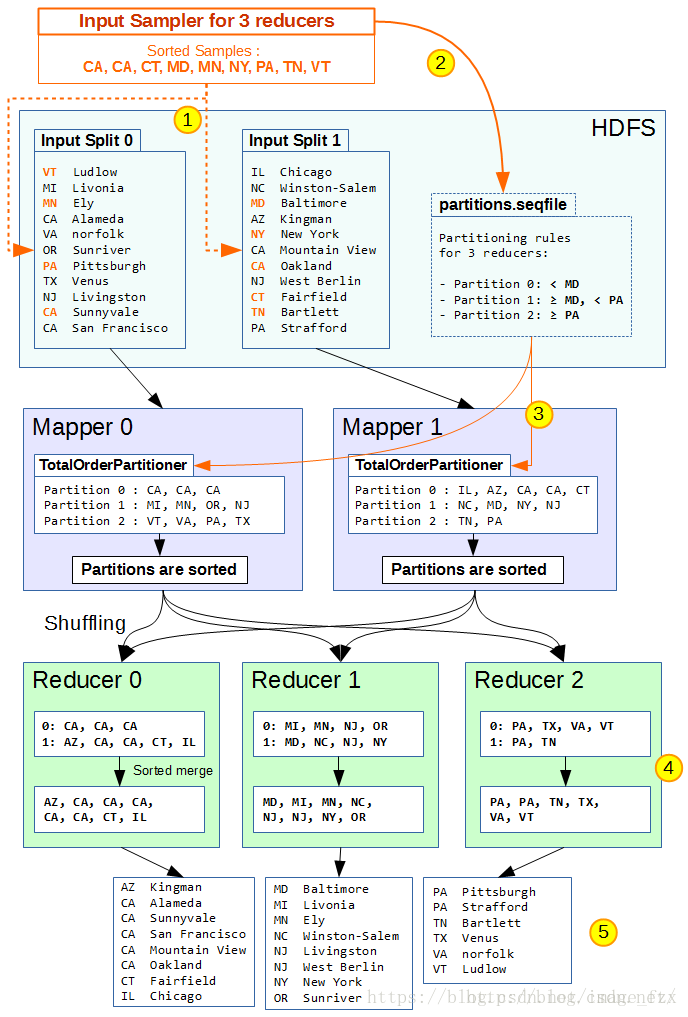 4、在shuffle阶段,每个Reducer会拉取对应分区中已排序的(key, value)。由于每个分区已按照partition file设置边界,这样分区1中的数据都比分区2小,分区2数据都比分区3小(假设升序排列)。