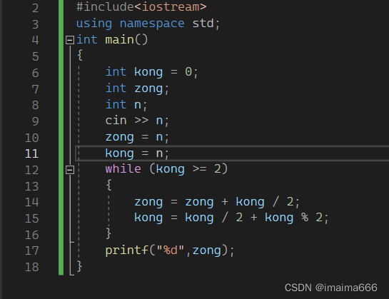 3.kong=kong/2,计算的是我换完后喝光再剩下的空瓶,kong%2求得是我换完后我还留下的不够我再去换汽水的空瓶,这样再次构成的空瓶。