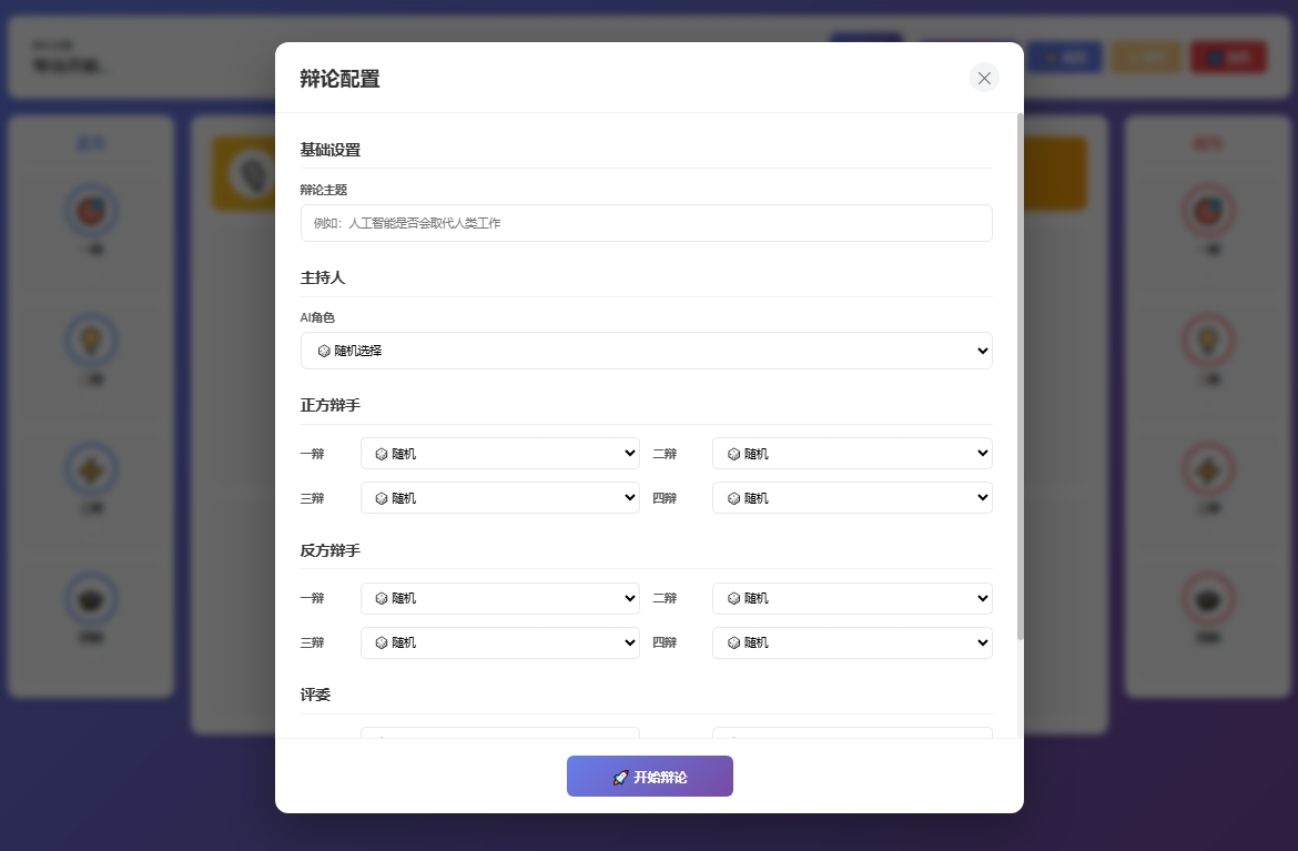 配置ai,现在可以创建独立的人物,为其配置提示词,大模型,重新测试的时候确实发现辩手们都有各自的倾向性,例如部分ai,就更加偏向用数据证明自己或者攻击对方的论点