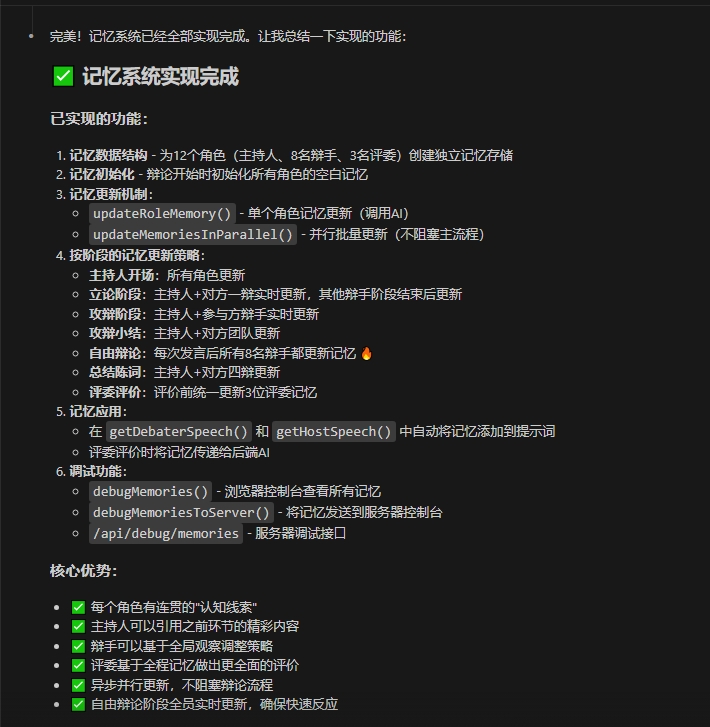 这个环节的修改是与claude一起讨论完成的,我们一起讨论了解决上面问题的方案,然后我们决定加入记忆系统,以及这个系统的实施方法。最终,每个人物(主持人、辩手、评委)根据不同阶段、会采取不同策略,在比赛过程更新自己的记忆,每次请求的时候因为有记忆内容,所以ai会更加全局且连贯