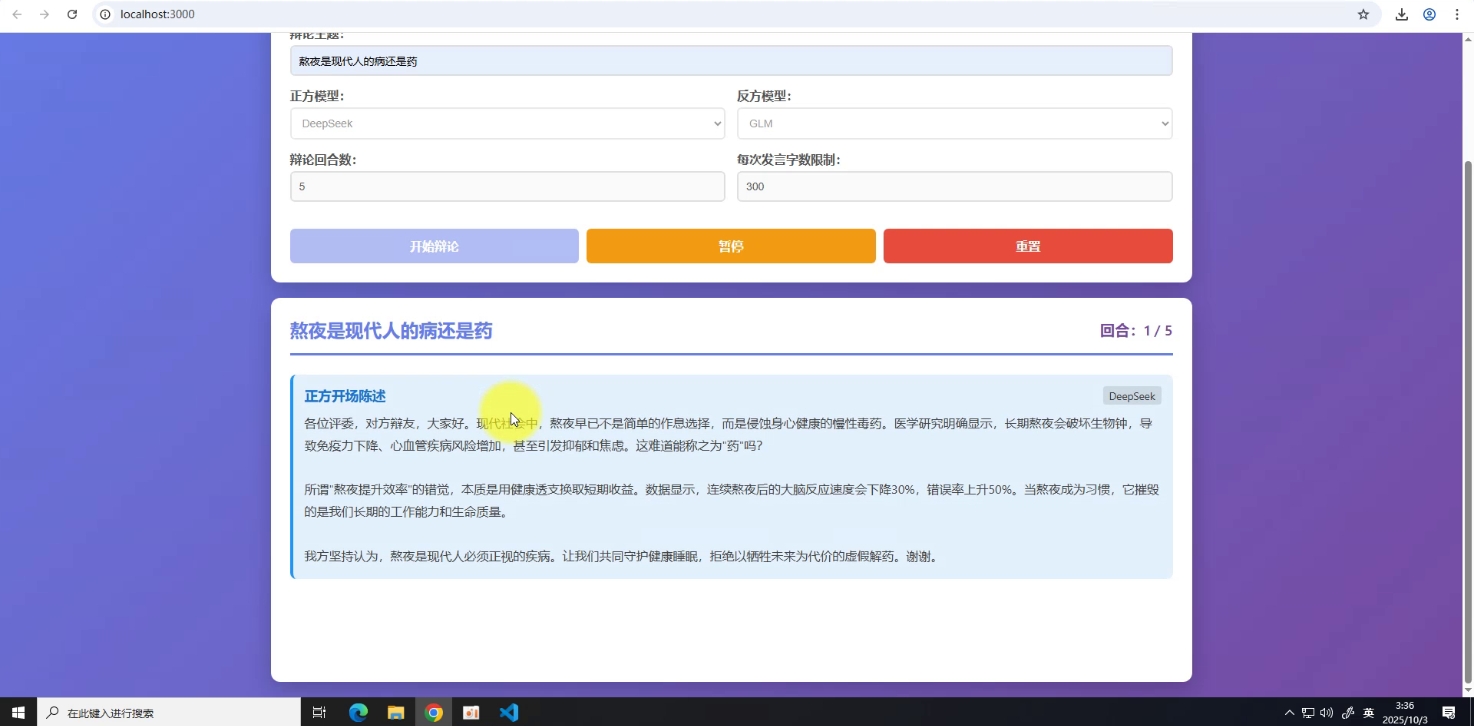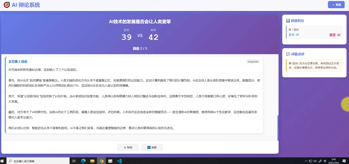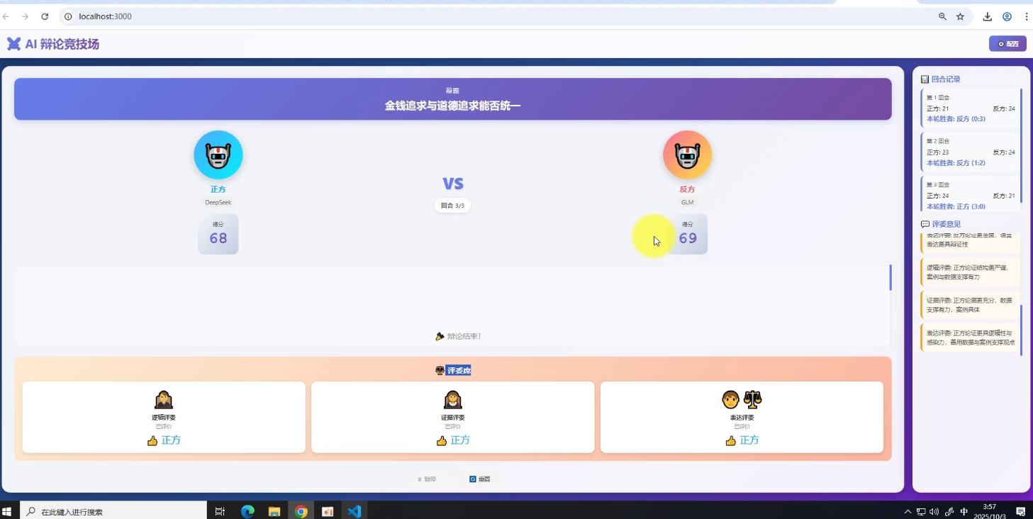 其实到这一步系统已经偏娱乐,不能区分模型强弱了,因为正方用的DeepSeek,反方用的GLM,评委也是GLM,较真的话要控制变量且经过很多轮的对照,才能看出问题