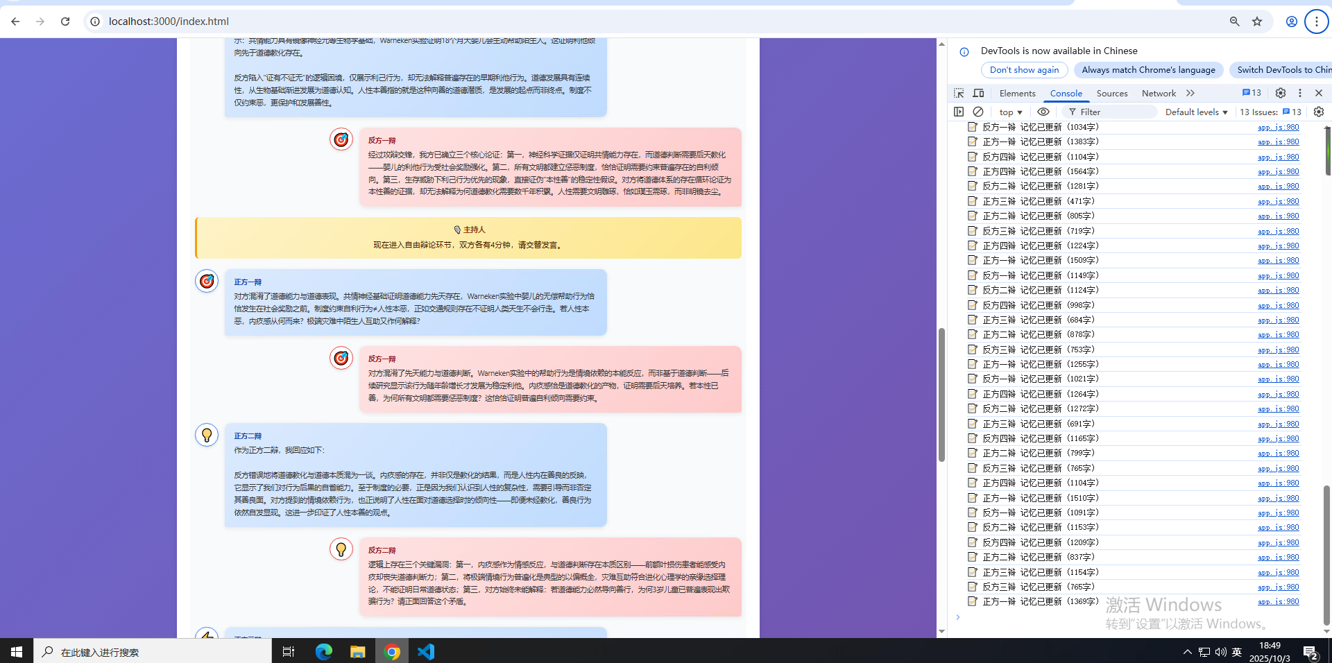 到这一步,虽然网页还是有点简陋,但核心流程基本是完整的,我看了几场辩论,发现还是有些问题
