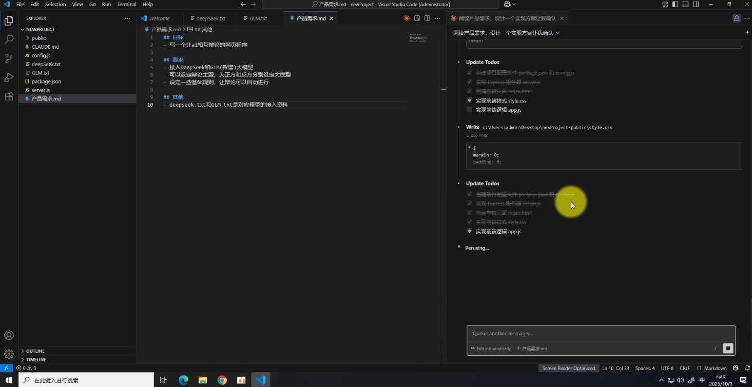 准备工作完成,然后启动claduecode,输入"阅读产品需求,帮我进行具体实现",模式调整成全自动,回车