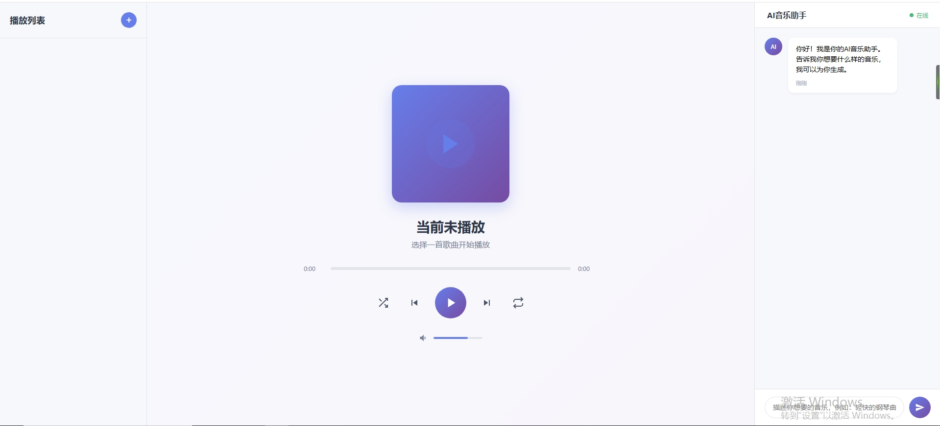我计划做一个音乐播放器,这个播放器通过ai生成歌曲并播放,现在我们先来完成界面设计,不用考虑如何实现,先设计一个音乐播放器页面,铺面整页,左边是播放列表,中间是播放区,右边是对话区(用于让用户与ai对话)