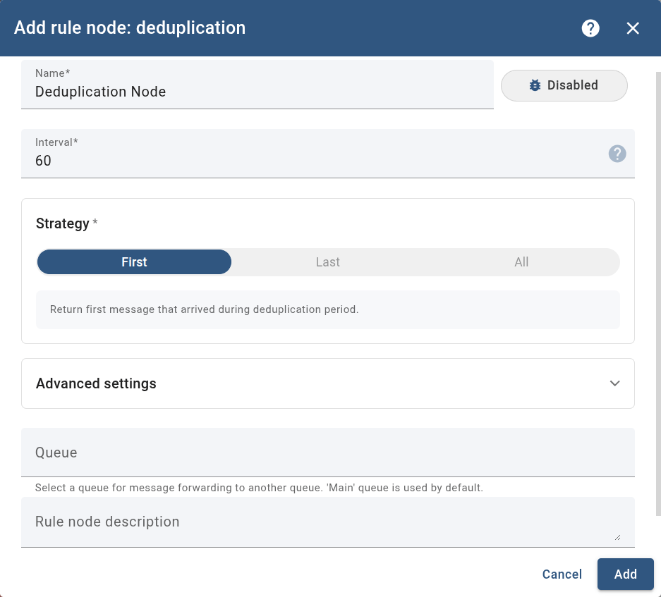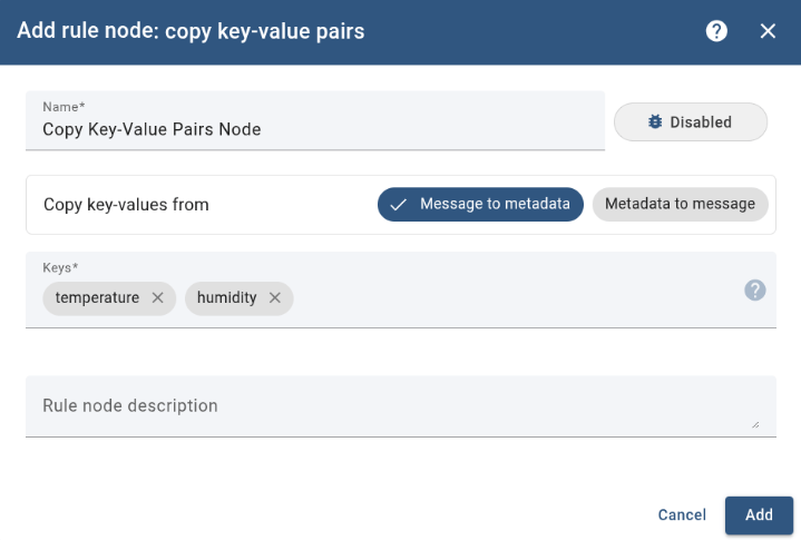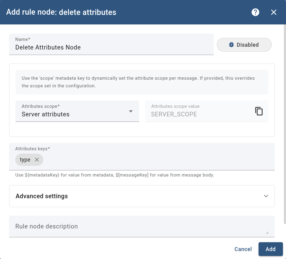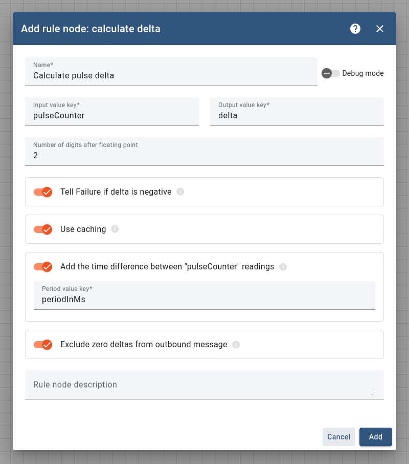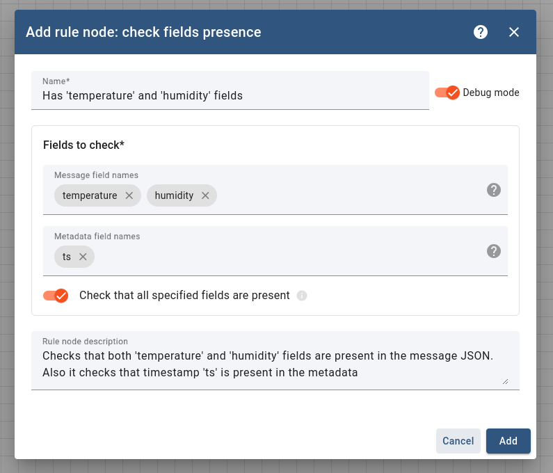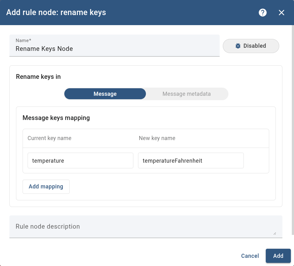 使用服务器时间戳(Use server timestamp)- 如果启用,当时间序列数据没有与其关联的显式时间戳时(使用有效负载格式 1 ),规则节点将使用当前服务器时间。