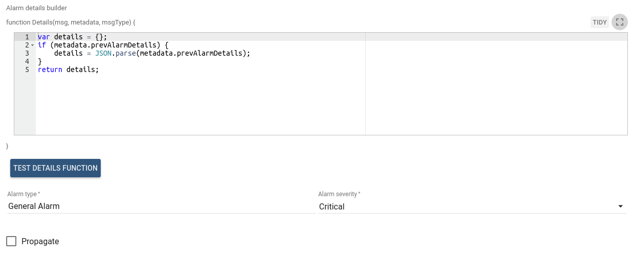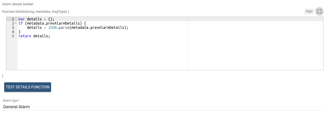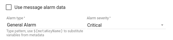 | ALARM | Alarm event | 创建、更新或删除警报时产生的事件 | 原始消息元数据中的所有字段 isNewAlarm - 如果刚刚创建了新警报,则为 true isExistingAlarm - 如果警报已经存在,则为 true isClearedAlarm - 如果警报已被清除,则为 true | 包含已创建警报详细信息的 json:{ |