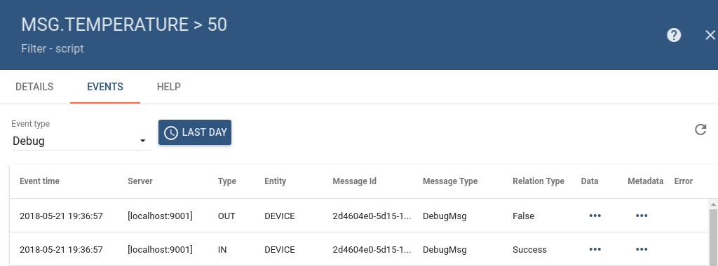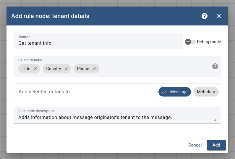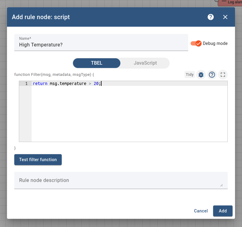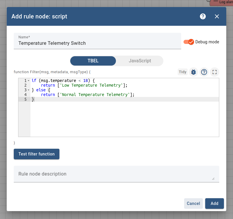ThingsBoard 提供了查看每个规则节点的传入和传出消息的功能。要启用调试,用户需要确保在主配置窗口中选中“调试模式”复选框