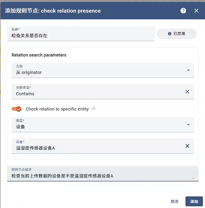 - 如果启用“检查与特定实体的关系”切换时存在与特定实体的指定关系。