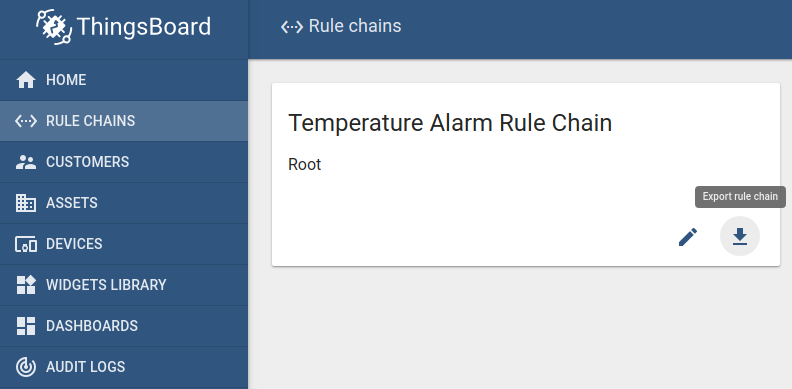 您可以将规则链导出为 JSON 格式,并将其导入到相同或另一个 ThingsBoard 实例。