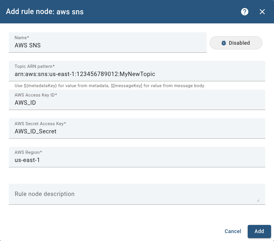 已发布的负载(Published payload)- 节点将向 SNS 发布完整的消息负载。如有需要,可以配置规则链,使用转换节点链将正确的负载发送到 SNS。