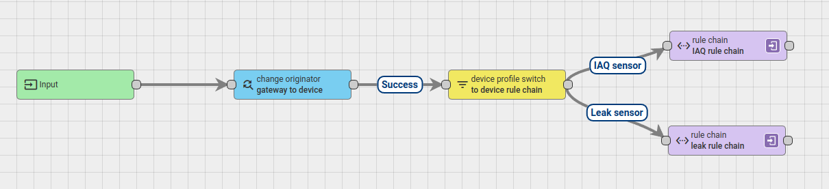 假设您有不同的信标配置文件——室内空气质量“IAQ传感器”设备配置文件和泄漏传感器“泄漏传感器”设备配置文件。以下规则链会将消息的发起者从网关更改为设备,并将消息转发到相应的规则链: