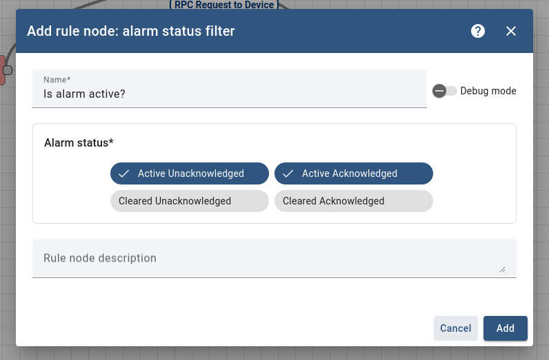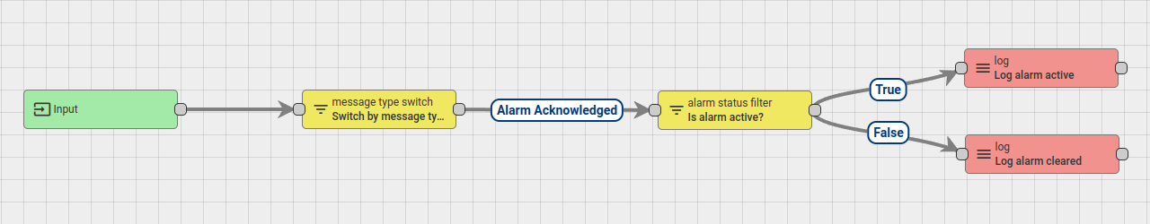 假设您需要处理当前处于活动状态的警报。您可以配置规则节点,以筛选“活动未确认”和“活动已确认”状态。此设置可确保仅进一步处理当前处于活动状态的警报(无论是否已确认)。