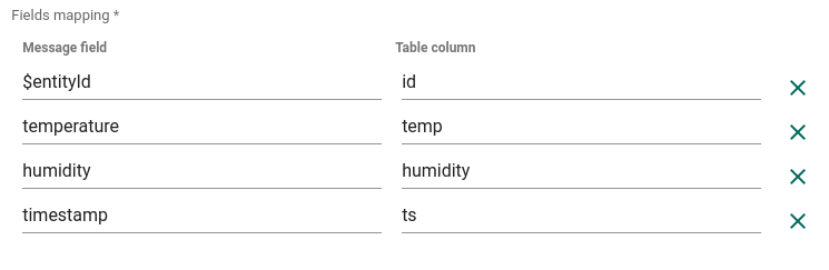 管理员可以配置消息字段名称与表列名称之间的映射。如果映射键为$entityId,即由消息发起者标识,则相应的列名称(映射值)将被写入消息发起者 ID。
