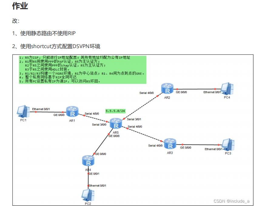 文章详细描述了如何在路由器R1-R5间配置PPPPAP/CHAP认证,HDLC封装,MGRE环境(包括shortcut),GRE隧道以及NAT,涉及IP地址设置、路由和访问控制策略。