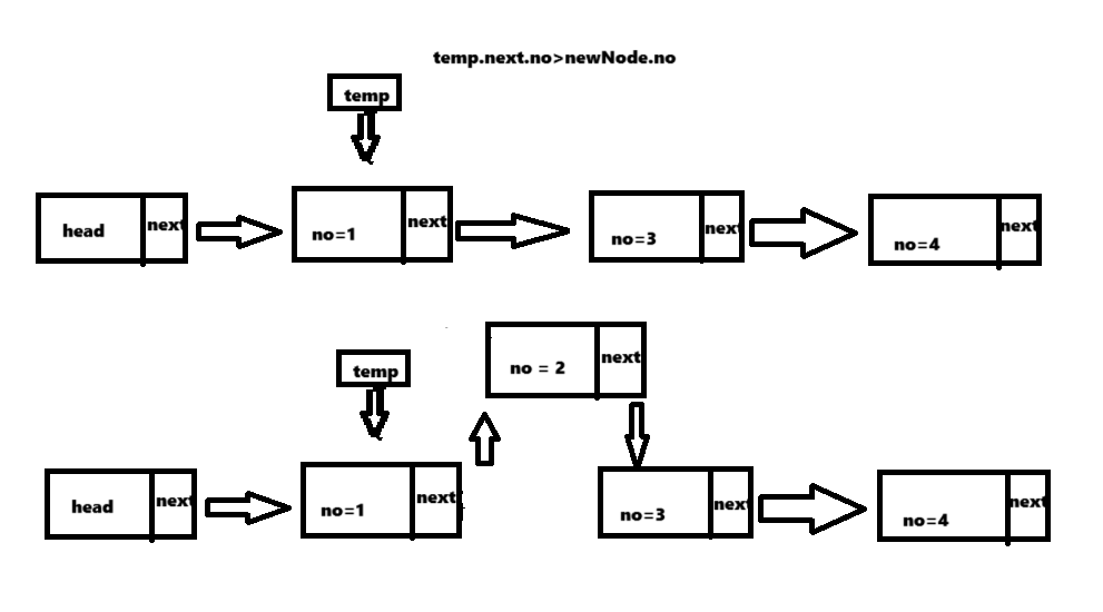 (1)遍历找到temp.next.no>newNode.no的那个节点,此时temp是需要插入位置的前一个节点。