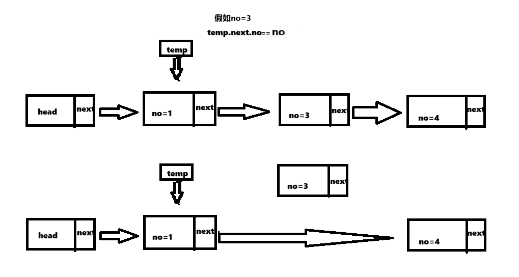 此时no=3的节点的next仍然指向no=4的节点,但是因为没有头节点无法遍历到该节点,说明该节点失效了。