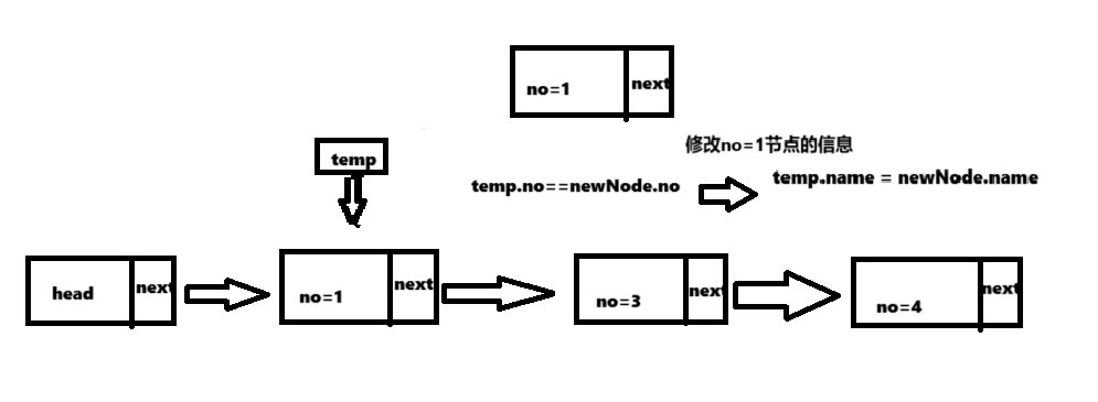主要逻辑:通过一个辅助指针遍历找到newNode.no在链表中的编号,然后通过指针来修改该节点的信息。