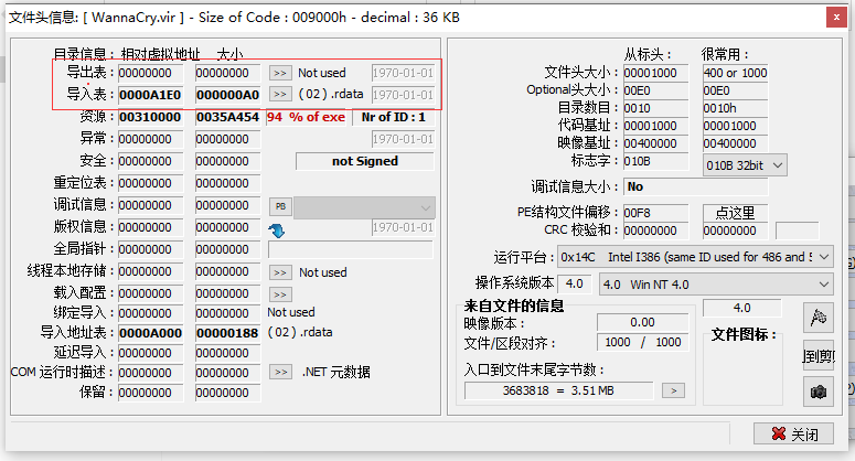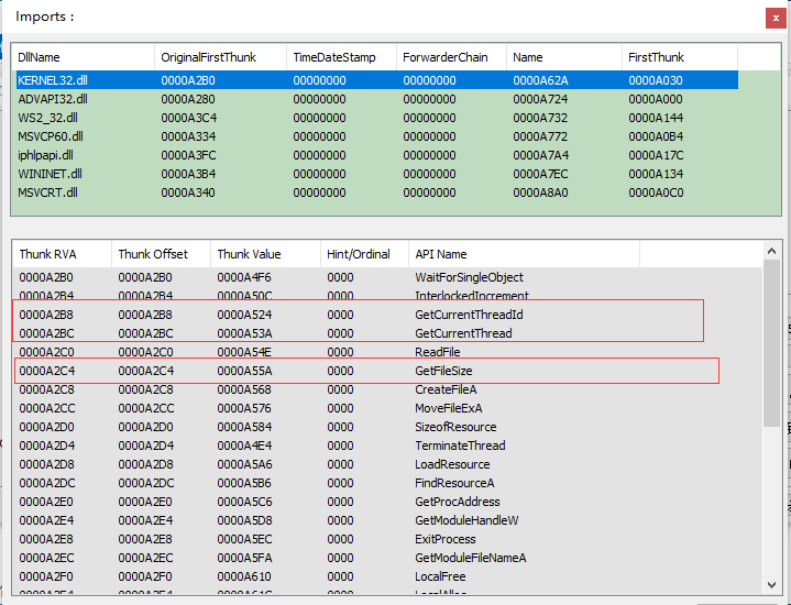 查看pe头部,因为导出表为0,所以我们查看导入表,分析导入的这些动态链接库,存在哪些windows api函数,来分析可能存在了哪些操作。