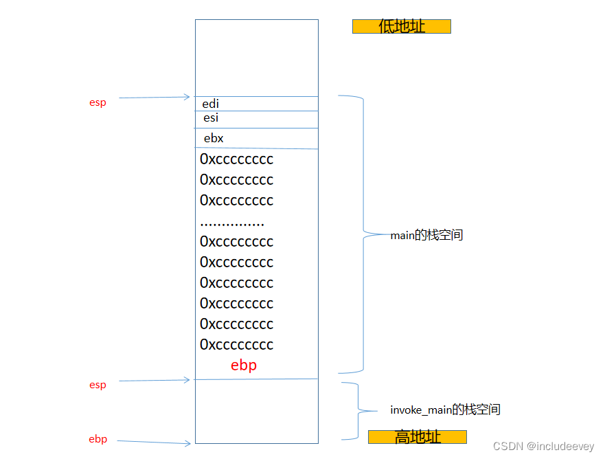 //将低地址esp-0xCC到高地址edp重复33次初始为0xcccccccc 再将0放在edp-8处,创建z