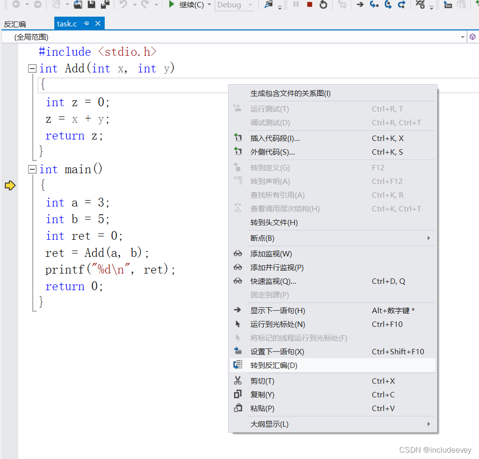 调用完Add函数,回到main函数的时候,继续往下执行,可以看到: