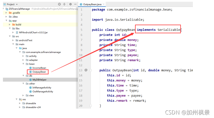 2.1 展开工程中的 bean 文件夹,打开收入信息类 IncomeBean 文件,添加 implements Serializable 即可。代码如下,