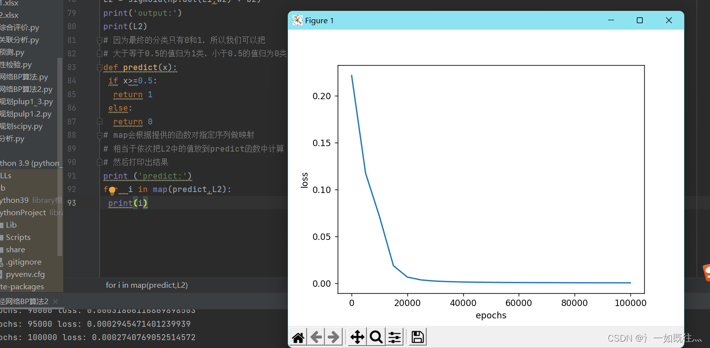 两段代码展示了BP神经网络的实现,分别处理逻辑运算和加或逻辑问题。第一段代码定义了激活函数、前向传播、反向传播和权重更新,并通过迭代优化权重。第二段代码为一个简单的两层神经网络,用于解决与或逻辑问题,通过sigmoid函数和梯度下降法更新权重,随着训练次数增加,损失函数逐渐减小。