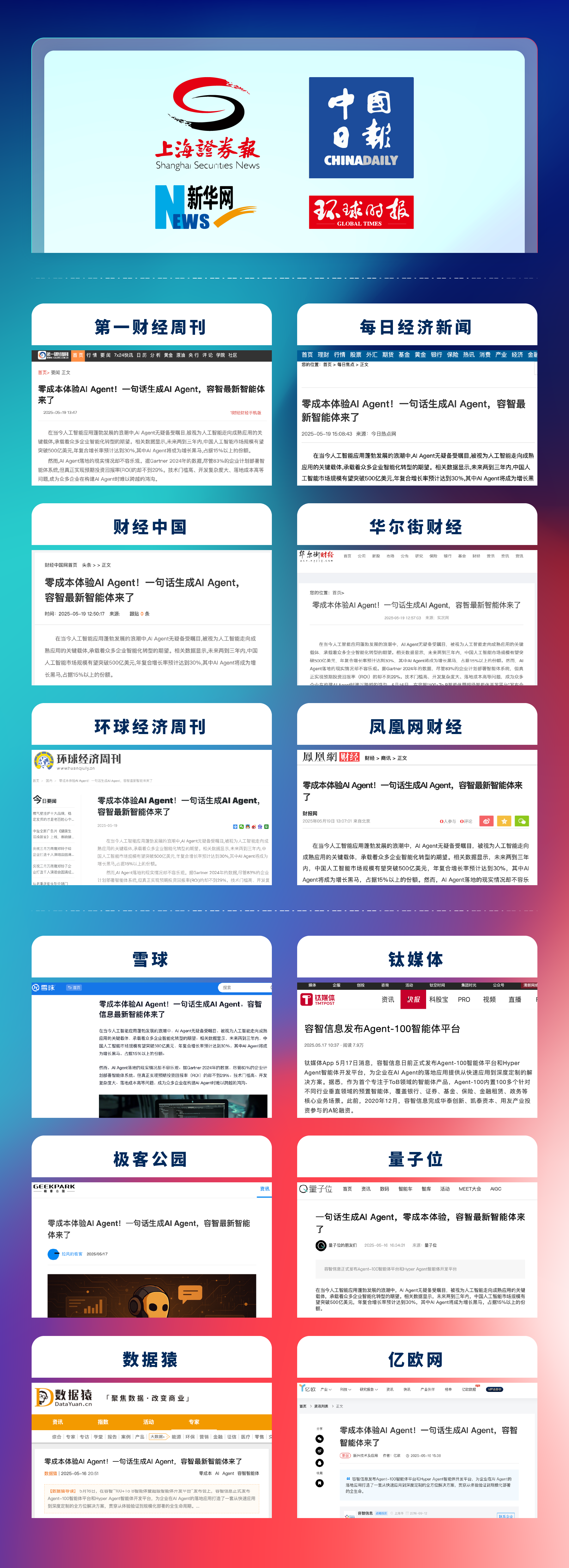 此外,新华社《上海证券报》、新华网、中国日报、环球时报等权威媒体定调,第一财经周刊、财联社、中国经济周刊、每日经济新闻等财经领域头部媒体,及雪球、钛媒体、极客公园、量子位、数据猿等等科技产业核心媒体纷纷聚焦商业价值与技术突破,高度认可容智Agent系列产品的战略布局与产业价值。