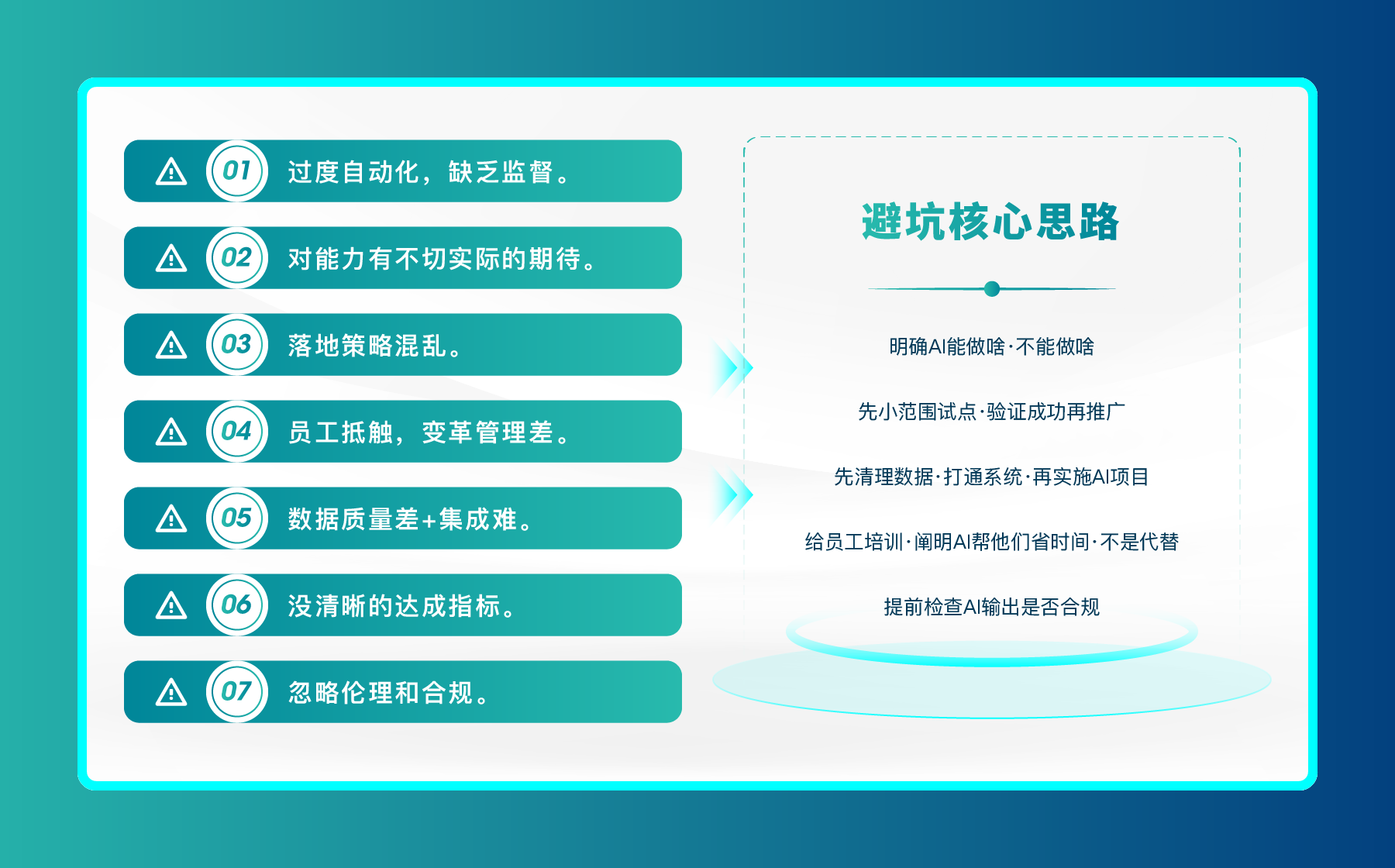 避坑核心思路:明确“AI能做啥、不能做啥”,对高风险、高复杂度环节保留人工监督;同时“提前检查AI输出是否合规”,通过流程设计确保异常可被及时拦截。