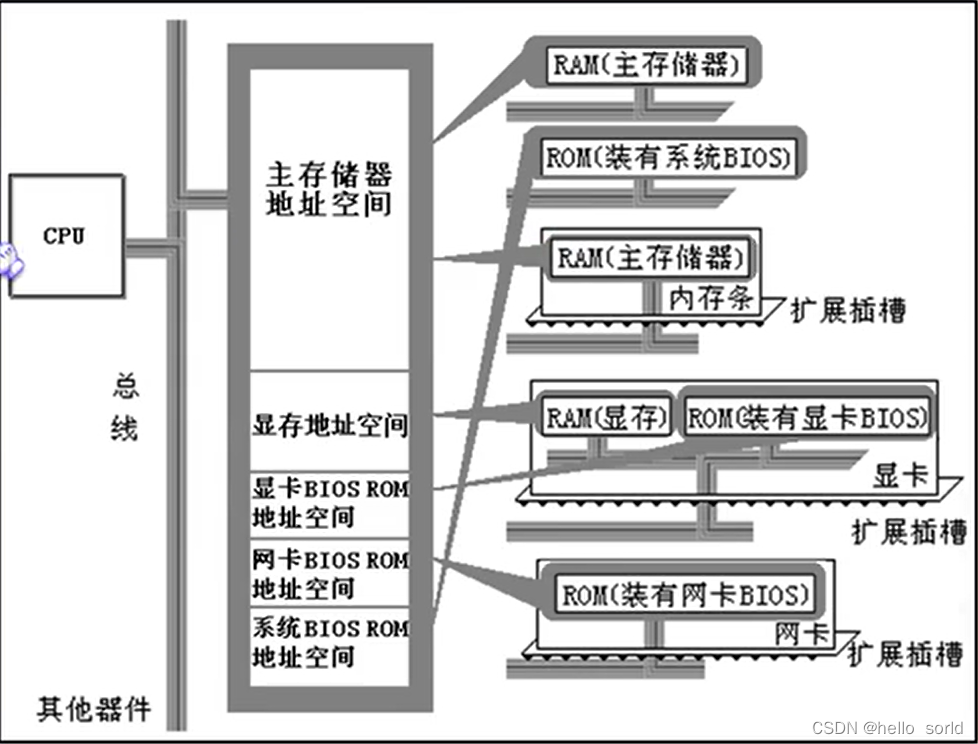 这张图就可以很直观的看出 CPU通过总线与内存相互连接, 主存被分成了四个区域,主存地址空间占用多半内存,扩展卡槽上的显卡,网卡,RAM(可读可写主存储器)是可以被更换的